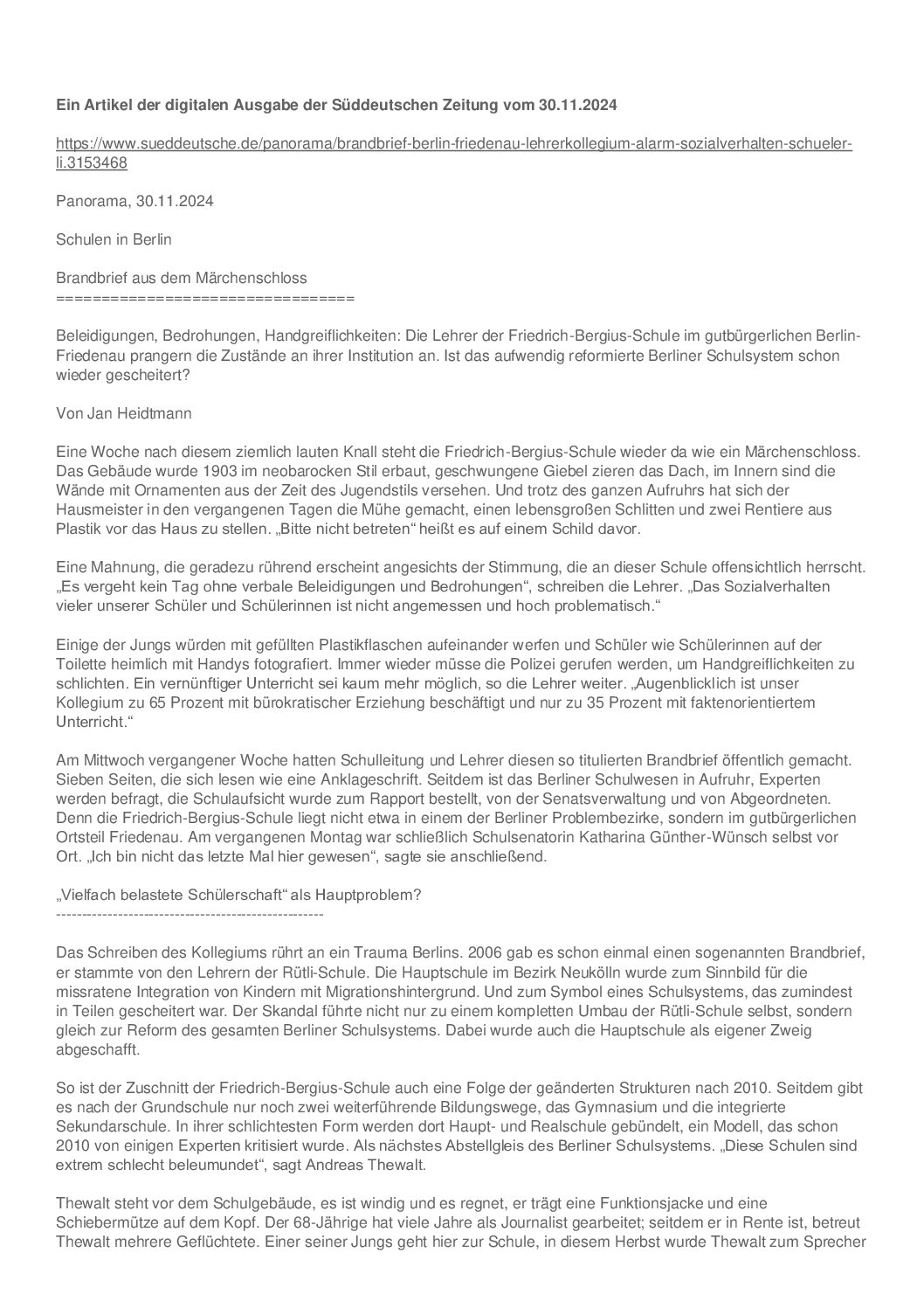 21.11.2024, Tagesspiegel, „Angst vor Schülergewalt: Friedenauer Lehrerkollegium ruft mit Brandbrief um Hilfe“ — mehr