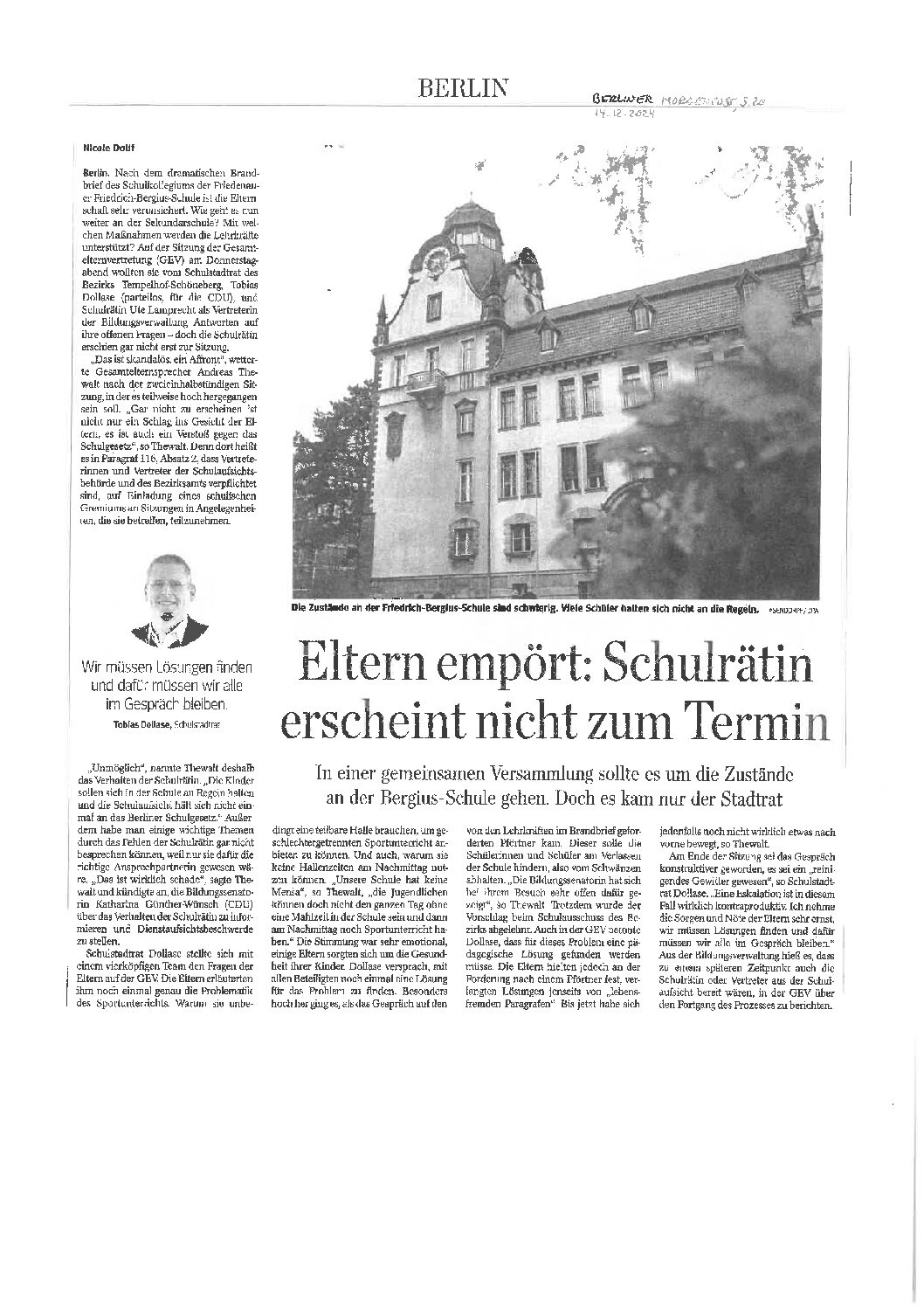 14.12.2024, berliner Morgenpost, „Eltern empoert Schulraetin erscheint nicht“