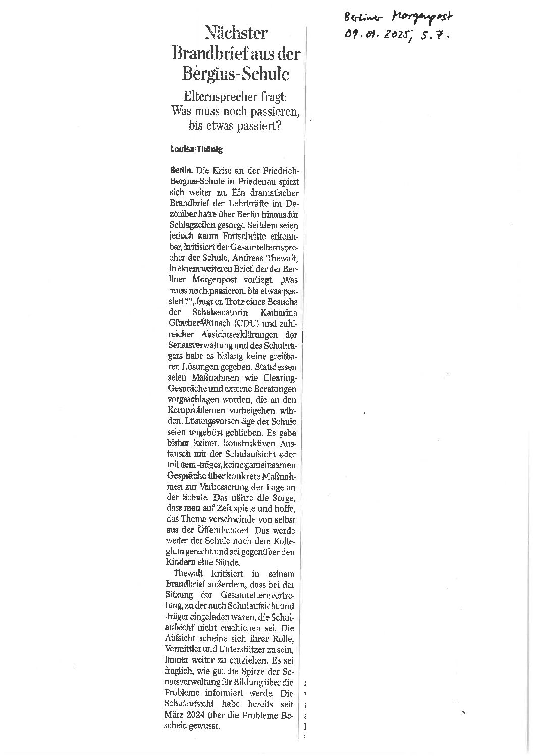 09.01.2025, berliner Morgenpost, „Nächster Brandbrief aus der Bergius-Schule“