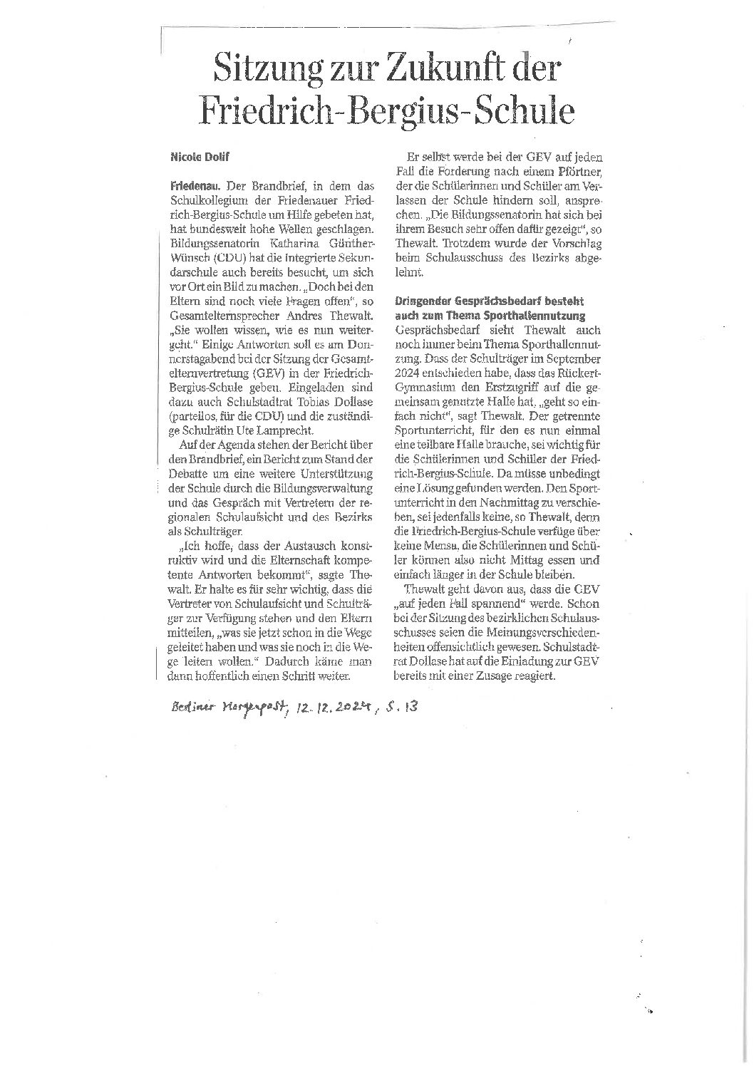 12.12.2024, berliner Morgenpost, „Sitzung zur Zukunft der Friedrich-Bergius-Schule“