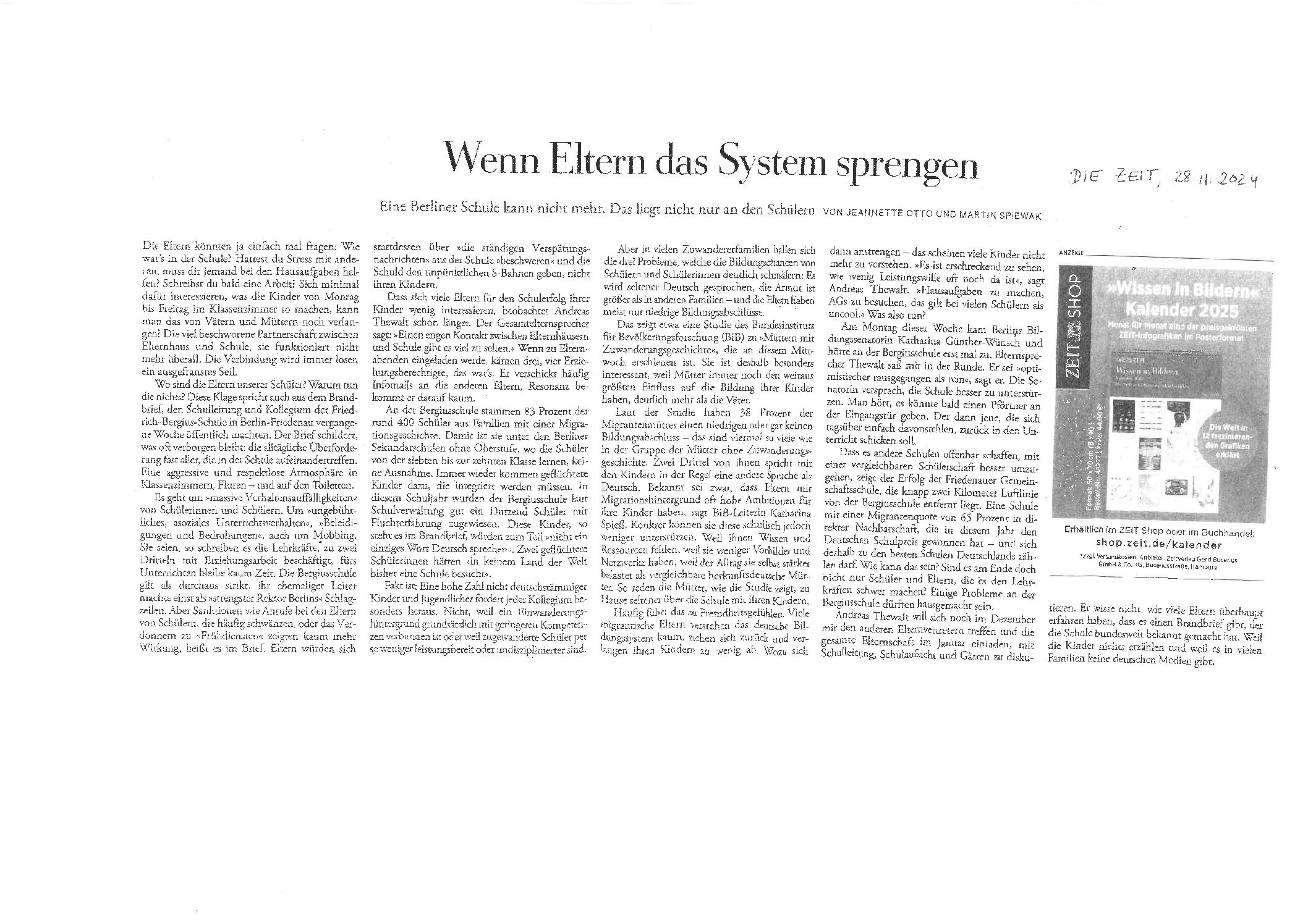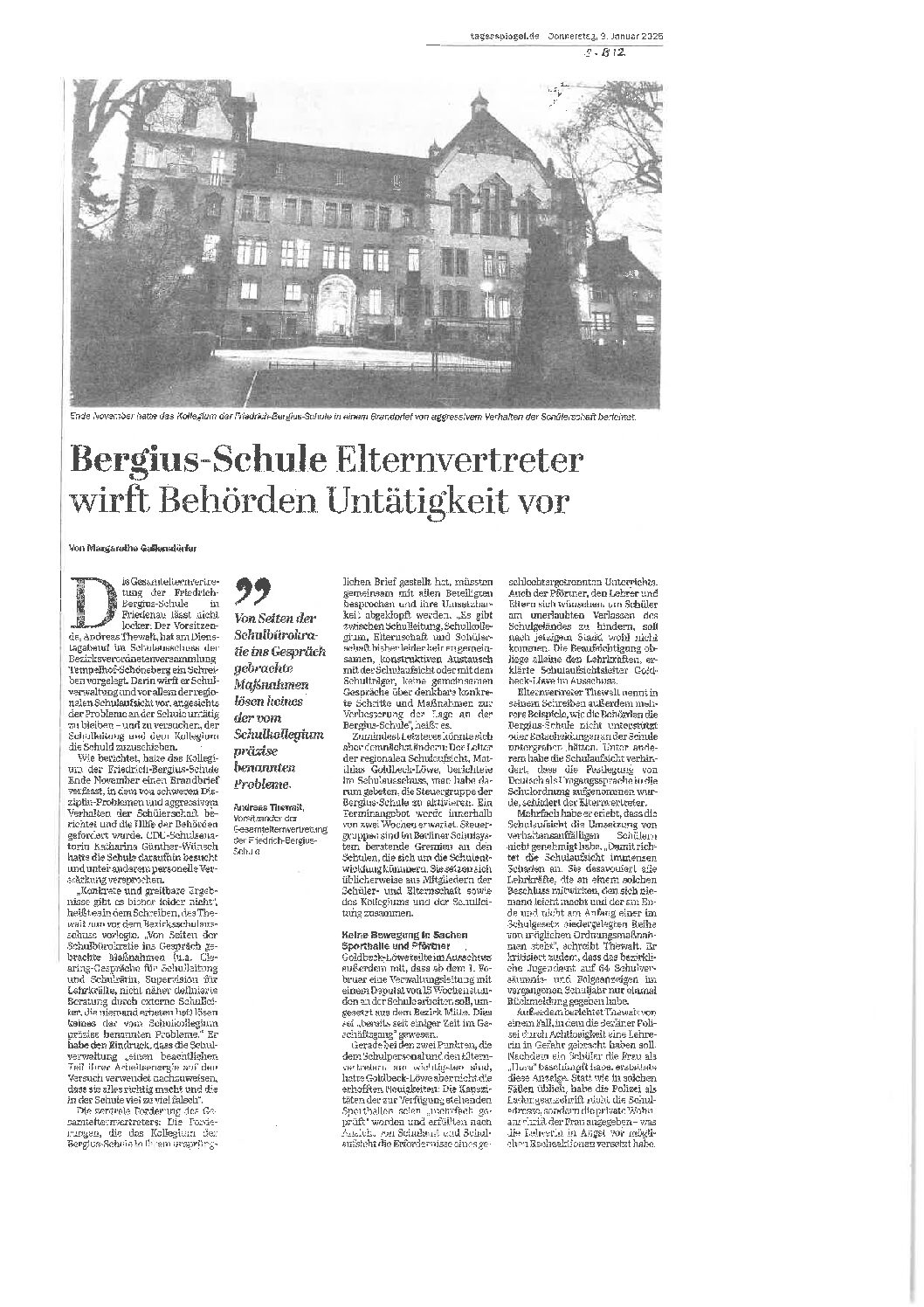 25.11.2024, Berliner Morgenpost, „Chaos an Friedrich-Bergius-Schule: Senatorin gibt Versprechen“ — mehr