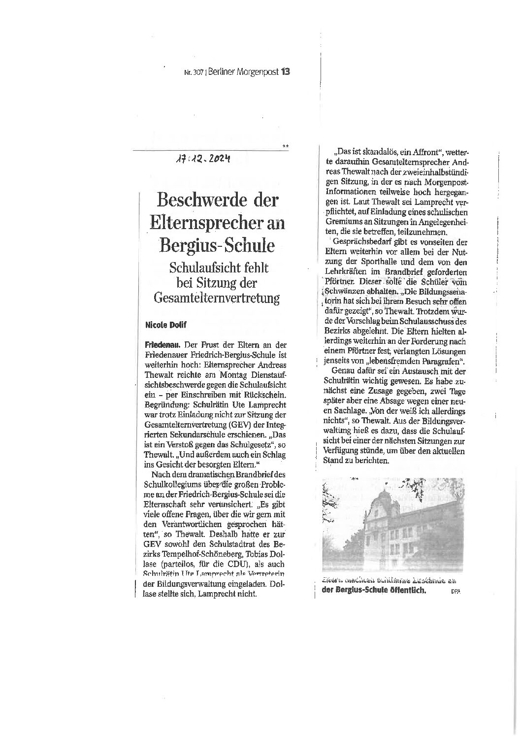 17.12.2024, berliner Morgenpost, „Beschwerde der Elternsprecher an Bergius-Schule Schulaufsicht fehlt bei Sitzung der Gesamtelternvertretung“