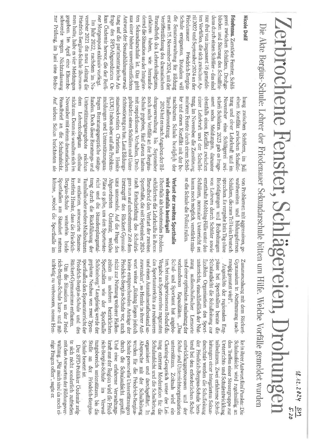 18.12.2024, berliner Morgenpost, „Zerbrochene Fenster, Schlägereien, Drohungen“