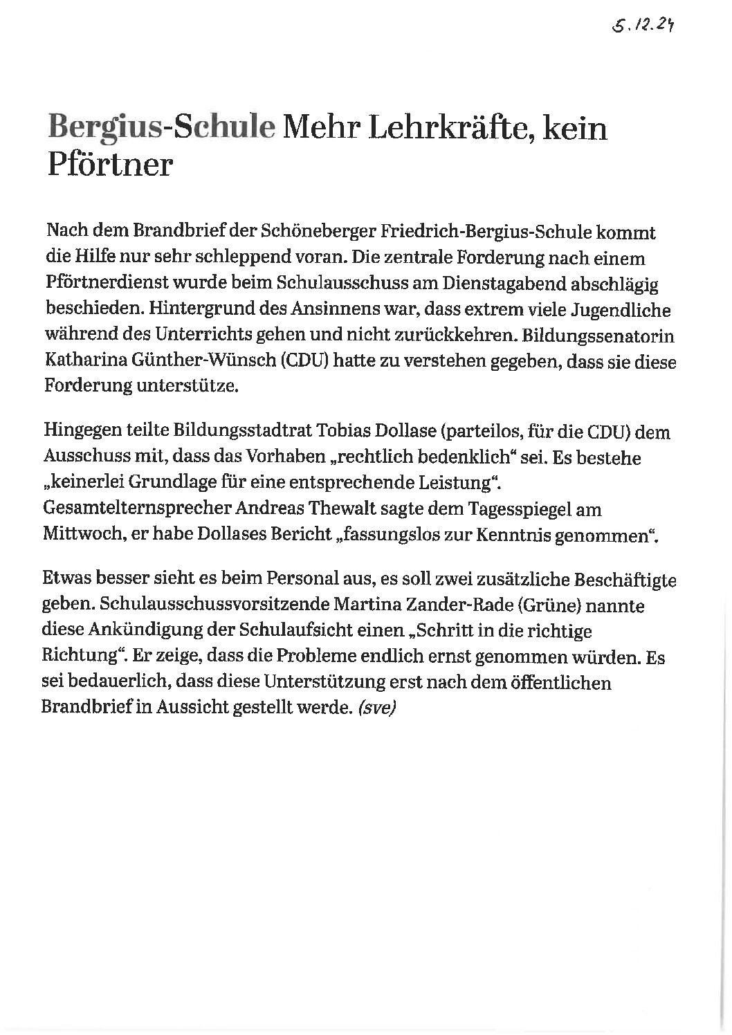 05.12.2024, Tagesspiegel, „Mehr Lehrkräfte, kein Pförtner“